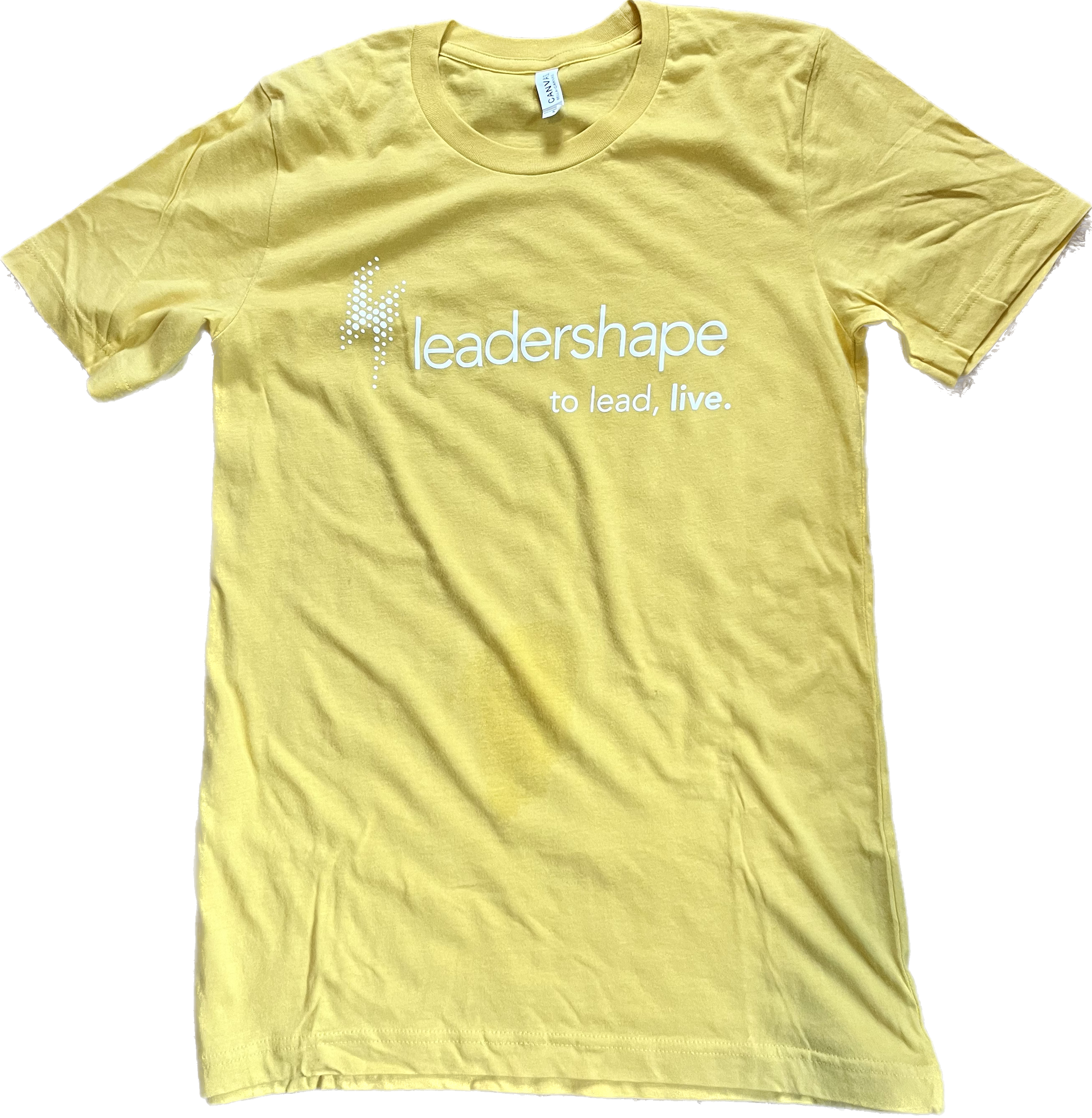 Yellow tshirt with bolt and "leadershape to lead, live" in white font.